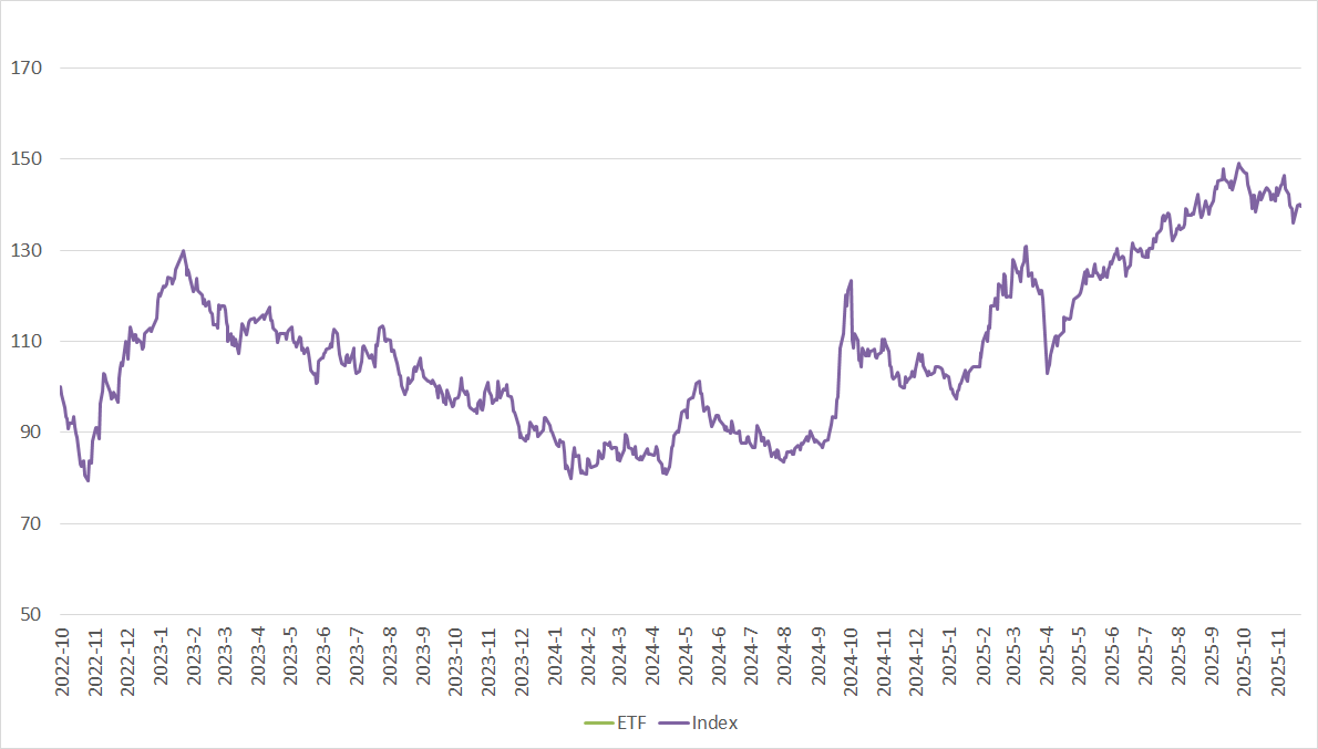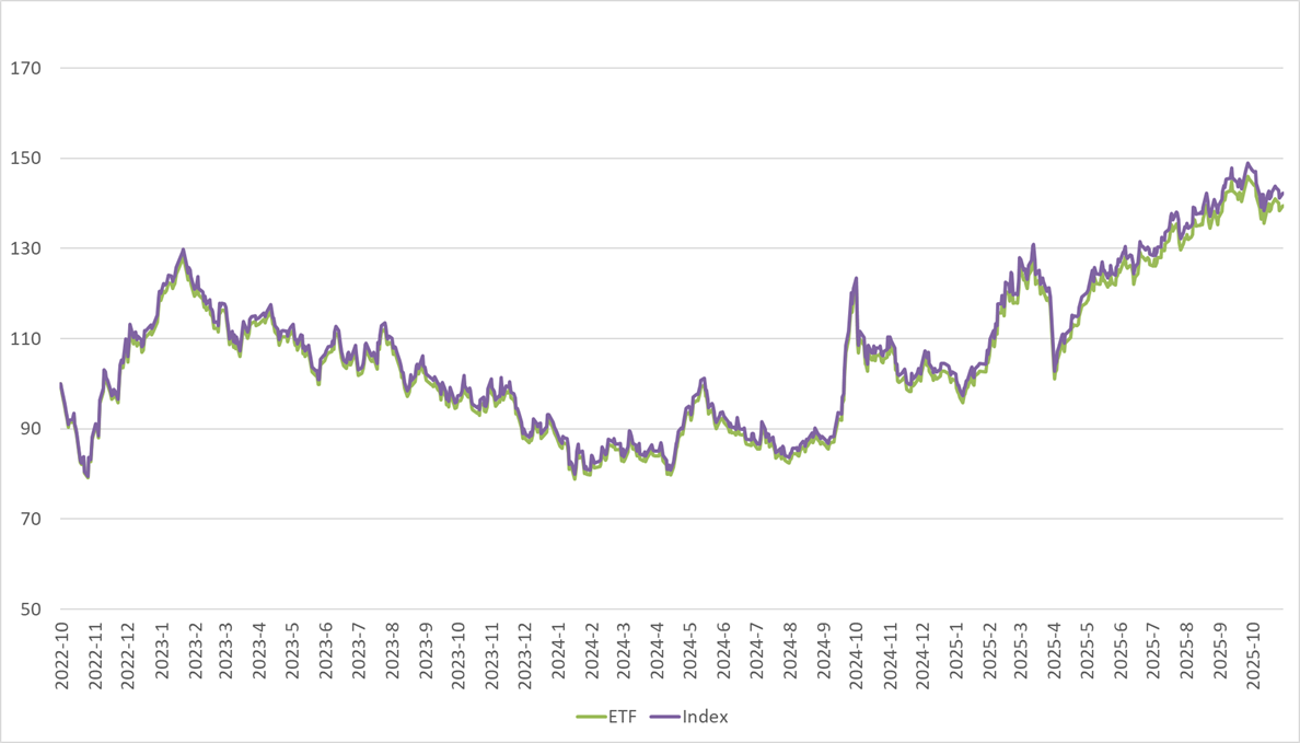 as of 31 Oct,2025 Fund Listing Date: 10 Oct,2022 Rolling 1-Year TD: -0.59% TD for calendar year 2024: -0.29 % TD for calendar year 2023: -0.08 % Tracking Error as of 31 Oct,2025 Fund Listing Date: 10 Oct,2022 Rolling 1-Year TE^: 0.11 % ^ Annualized based on the number of dealing days in the past year when daily TD is calculated. |