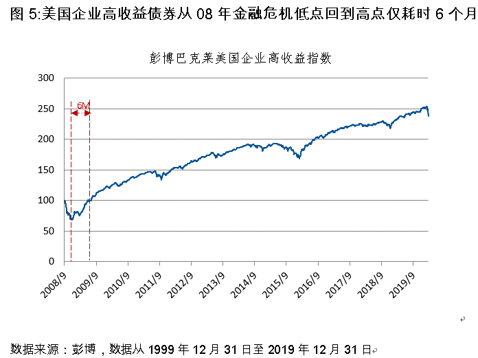 和以上几类传统风险资产比,历史表明,美国企业高收益债券或许是反弹较快且比较不容易会抄底失手的资产。同样以08年这样百年一遇的金融危机为例,高收益债券(以彭博巴克莱美国企业高收益总回报指数为例)仅仅花了6个月的时间,就反弹到了前期高点,而其他小的金融周期中,大部分时间底部反弹到前期高点的时间普遍在1-3个月,可以说是记录非常良好。