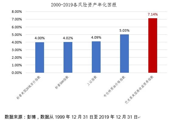 如此良好的记录,是不是该类高收益债券收益也不会太高呢?直觉貌似是这样的,但实际不是。从过去20年各类风险资产的年化回报来看,彭博巴克莱美国企业高收益总回报指数以7.14%的收益列各类风险资产第一。