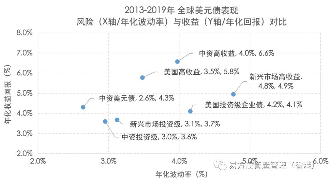 以2013-2019年全球美元债市场为例,中资和新兴市场高收益美元债波动率均高于投资级债券,与此同时,投资者亦获得了更高的信用溢价收益,体现了收益与风险相匹配原则。对比来看,中资高收益债年化收益显著优于新兴市场高收益债,且波动率更低,说明中资高收益债在这段投资期间具有更高的收益风险比。
