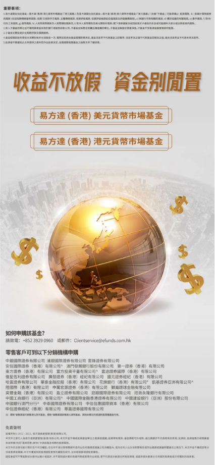 · 与香港市场上现有的货币基金一般需要T+2个工作日交割不同,易方达(香港)美元货币市场基金和港元货币市场基金均实行快速赎回机制。