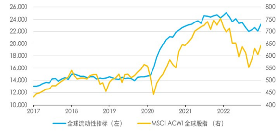 除此以外,全球流动性环境亦处于阶段性改善的阶段。美联储虽然开启了缩表进程,但如果我们把"美联储资产负债表 + 财政部现金余额变动 + 联储隔夜逆回购变动"作为美元流动性的指标,该指标在过去六个月是基本稳定的。而欧央行虽然开始缩表,但由于日本央行维持YCC的压力加大,反而被迫在向市场释放基础货币。我们根据美国、欧洲、日本的"资产负债表 + 财政部现金余额变动 + 联储隔夜逆回购变动"等数据加总,以美元计算,拟合出美欧日流动性指标,该指标在过去六个月亦出现回升,并且可能在今年上半年继续维持较高水平。