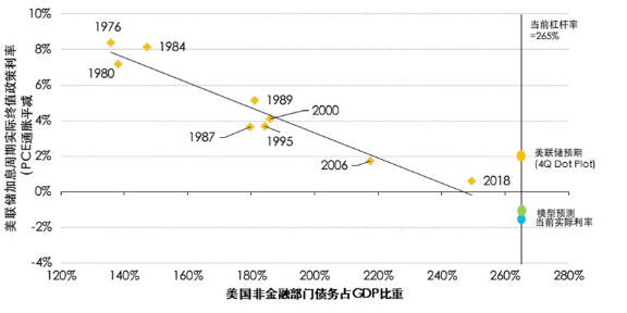 图5. 美国非金融部门债务占GDP比重及美联储加息周期实际终值政策利率图