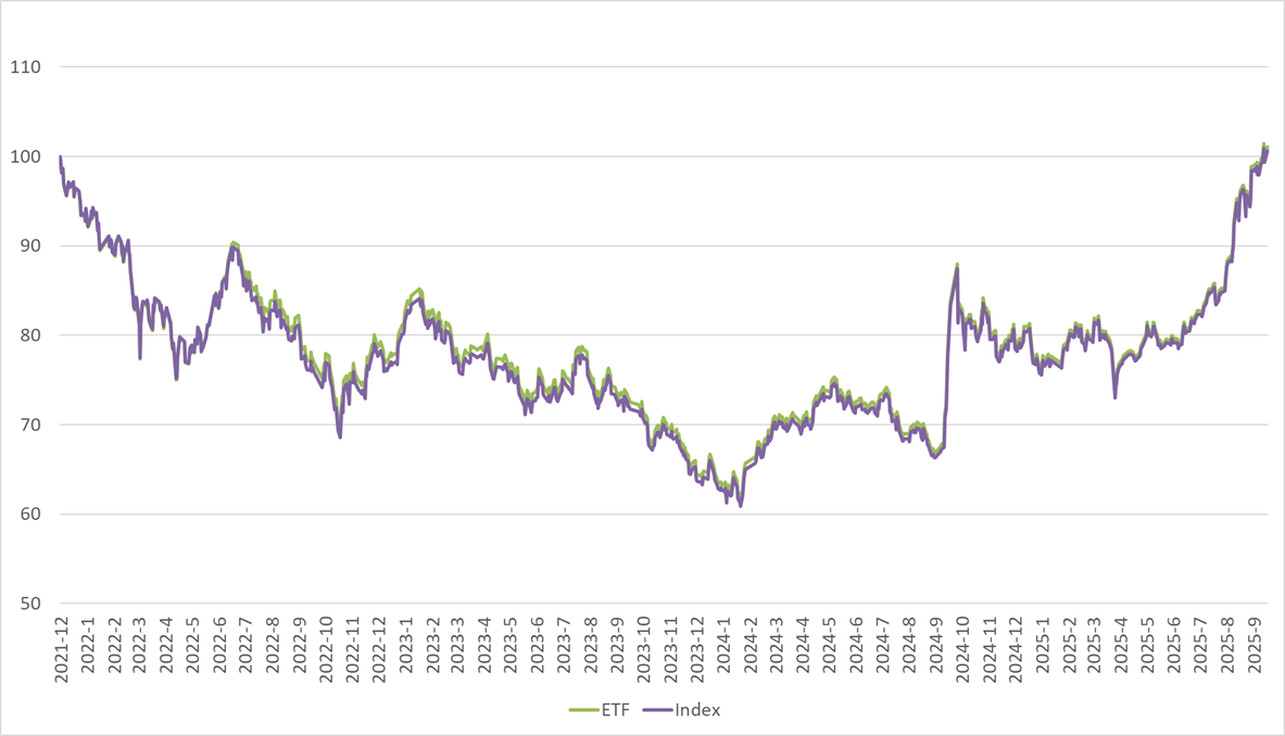 截至 2025年9月30日 上市日期: 2021年12月14日 1年跟蹤偏離度: -0.25% 2024年的跟蹤偏離度: -0.50 % 2023年的跟蹤偏離度: -0.14 % 2022年的跟蹤偏離度: 0.47 % 跟蹤誤差 截至 2025年9月30日 上市日期: 2021年12月14日 1年跟蹤誤差^: 0.14 % ^根據過去一年計算每日跟蹤誤差的交易日日數年化推算 |